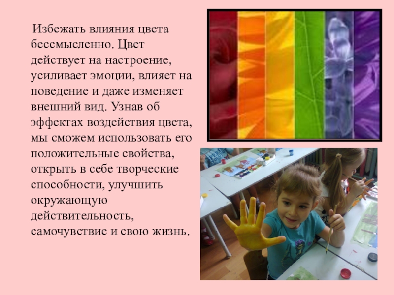 Слайд 10 Избежать влияния цвета бессмысленно. Цвет действует на настроение,