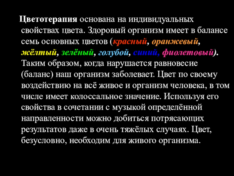 Слайд 9 Цветотерапия основана на индивидуальных свойствах цвета. Здоровый организм имеет