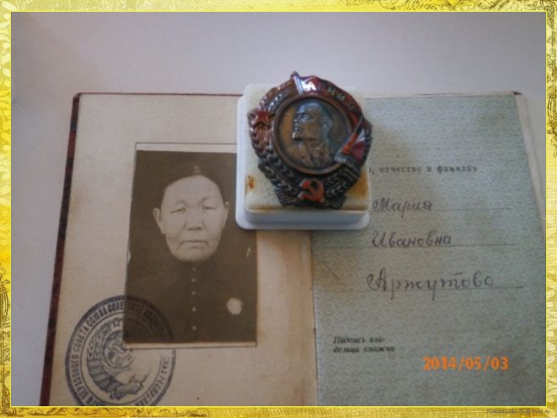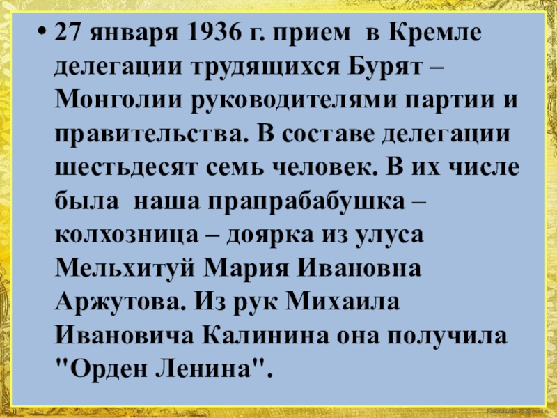 Бурят – Монголии руководителями партии и правительства. В составе делегации шестьдесят семь человек. В их числе была наша прапрабабушка – колхозница – доярка из улуса Мельхитуй Мария Ивановна Аржутова. Из рук Михаила Ивановича Калинина она получила "Орден Ленина".