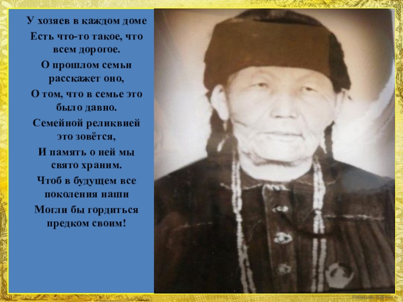 У хозяев в каждом домеЕсть что-то такое, что всем дорогое.О прошлом семьи расскажет оно,О том, что