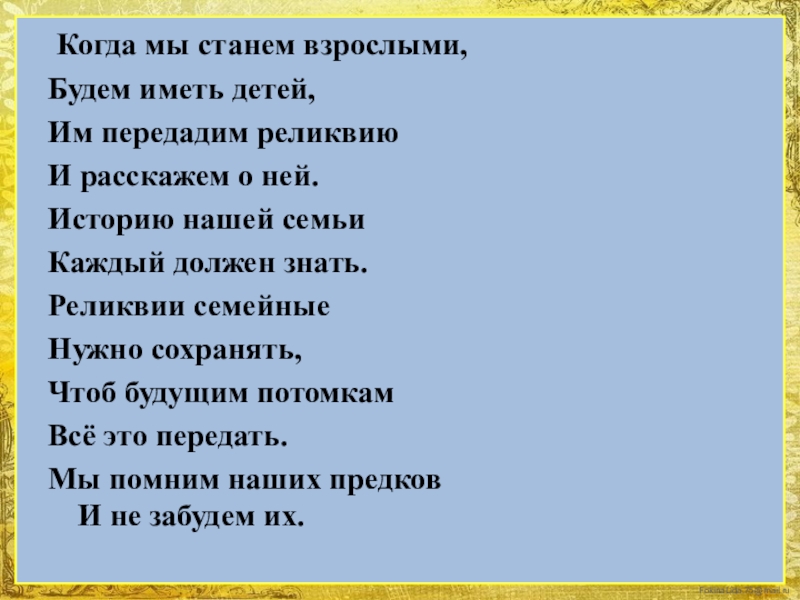 Когда мы станем взрослыми,Будем иметь детей,Им передадим реликвиюИ расскажем о ней.Историю нашей семьиКаждый должен знать.Реликвии