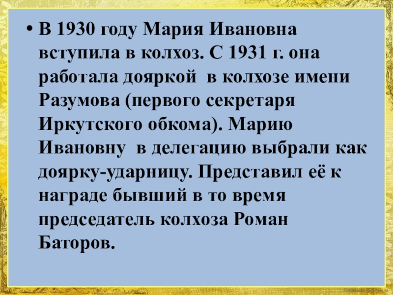 1931 г. она работала дояркой в колхозе имени Разумова (первого секретаря Иркутского обкома). Марию Ивановну в делегацию выбрали как доярку-ударницу. Представил её к награде бывший в то время председатель колхоза Роман Баторов.
