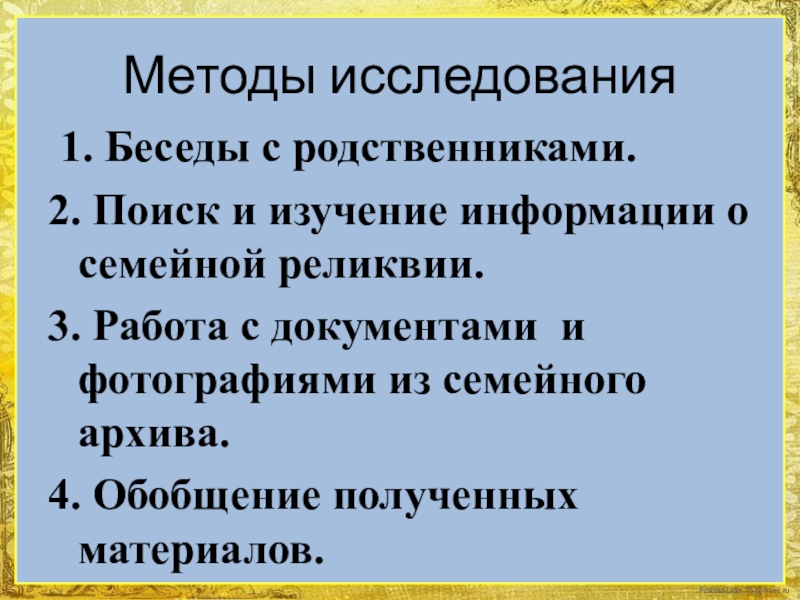 Методы исследования 1. Беседы с родственниками.2. Поиск и изучение информации о семейной реликвии.3. Работа с документами и