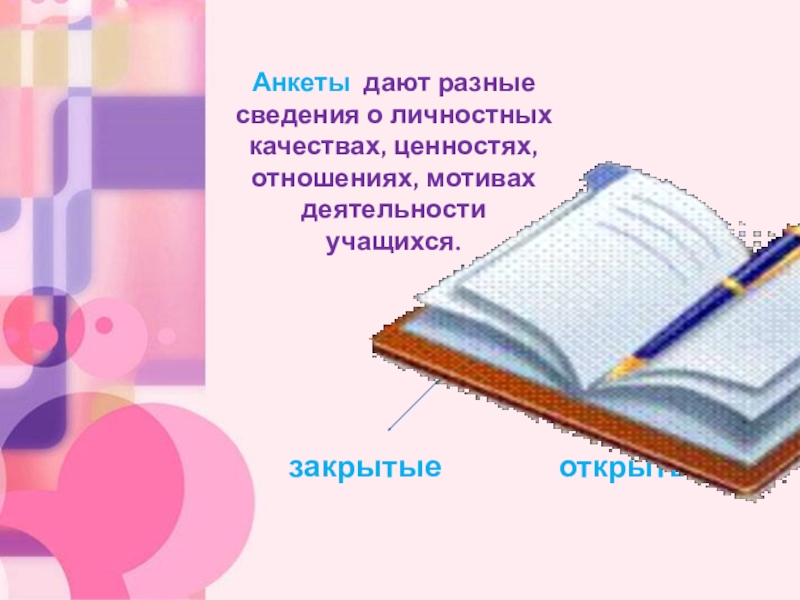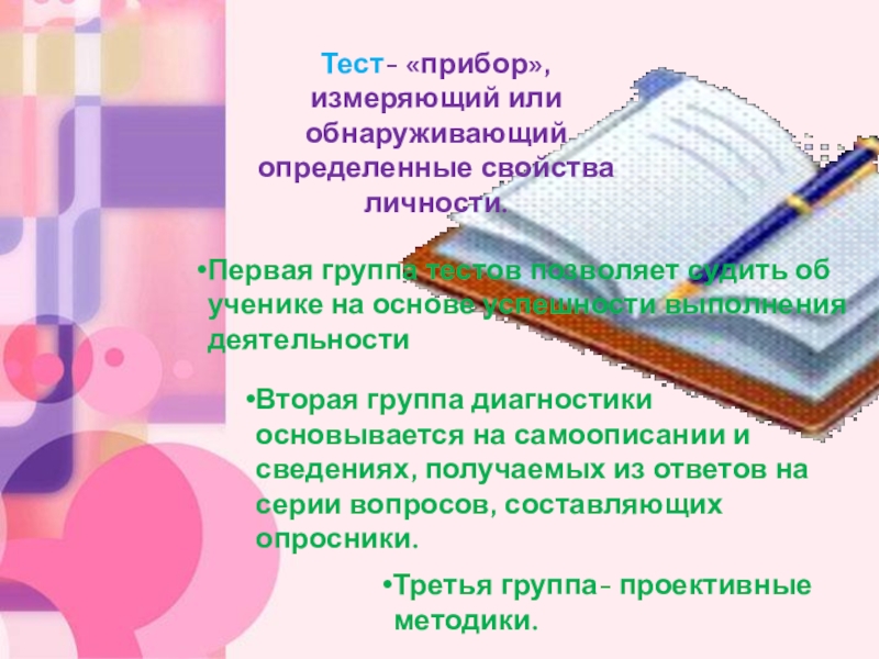 Вторая группа диагностики основывается на самоописании и сведениях, получаемых из ответов на серии вопросов, составляющих опросники.