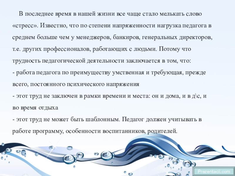 «стресс». Известно, что по степени напряженности нагрузка педагога в среднем больше чем у менеджеров, банкиров, генеральных директоров, т.е. других профессионалов, работающих с людьми. Потому что трудность педагогической деятельности заключается в том, что: