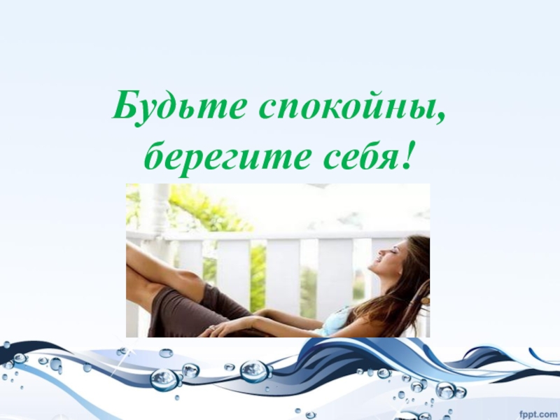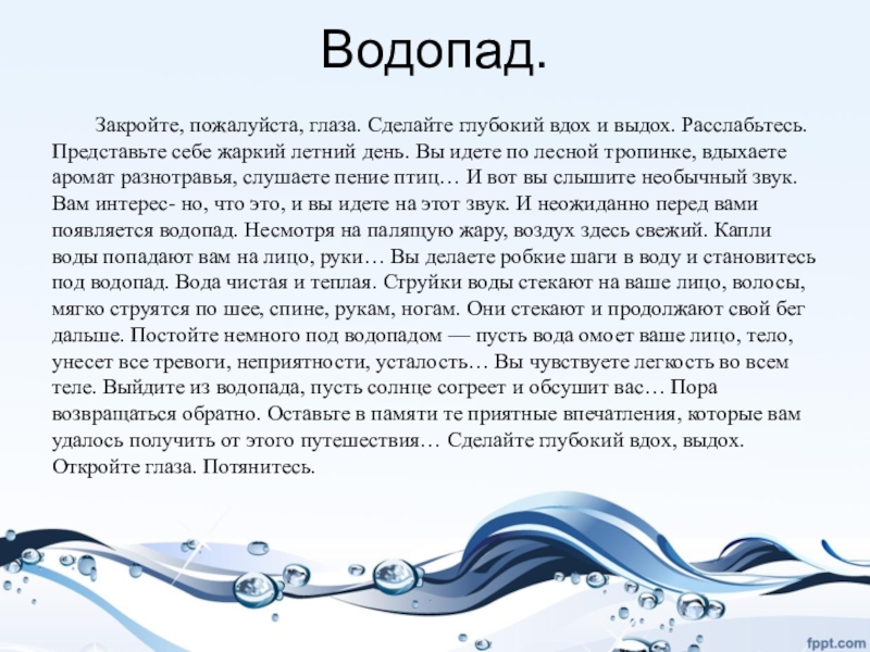 жаркий летний день. Вы идете по лесной тропинке, вдыхаете аромат разнотравья, слушаете пение птиц… И вот вы слышите необычный звук. Вам интерес- но, что это, и вы идете на этот звук. И неожиданно перед вами появляется водопад. Несмотря на палящую жару, воздух здесь свежий. Капли воды попадают вам на лицо, руки… Вы делаете робкие шаги в воду и становитесь под водопад. Вода чистая и теплая. Струйки воды стекают на ваше лицо, волосы, мягко струятся по шее, спине, рукам, ногам. Они стекают и продолжают свой бег дальше. Постойте немного под водопадом — пусть вода омоет ваше лицо, тело, унесет все тревоги, неприятности, усталость… Вы чувствуете легкость во всем теле. Выйдите из водопада, пусть солнце согреет и обсушит вас… Пора возвращаться обратно. Оставьте в памяти те приятные впечатления, которые вам удалось получить от этого путешествия… Сделайте глубокий вдох, выдох. Откройте глаза. Потянитесь.