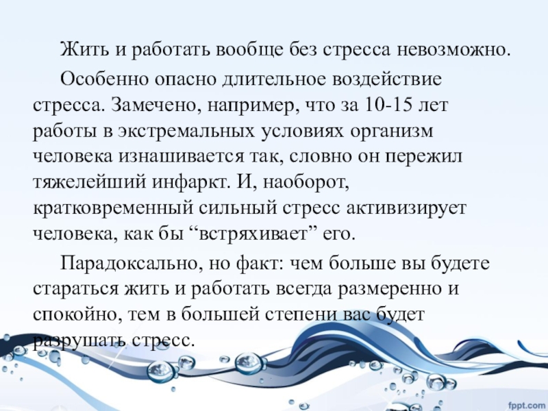 Слайд 11 Жить и работать вообще без стресса невозможно.