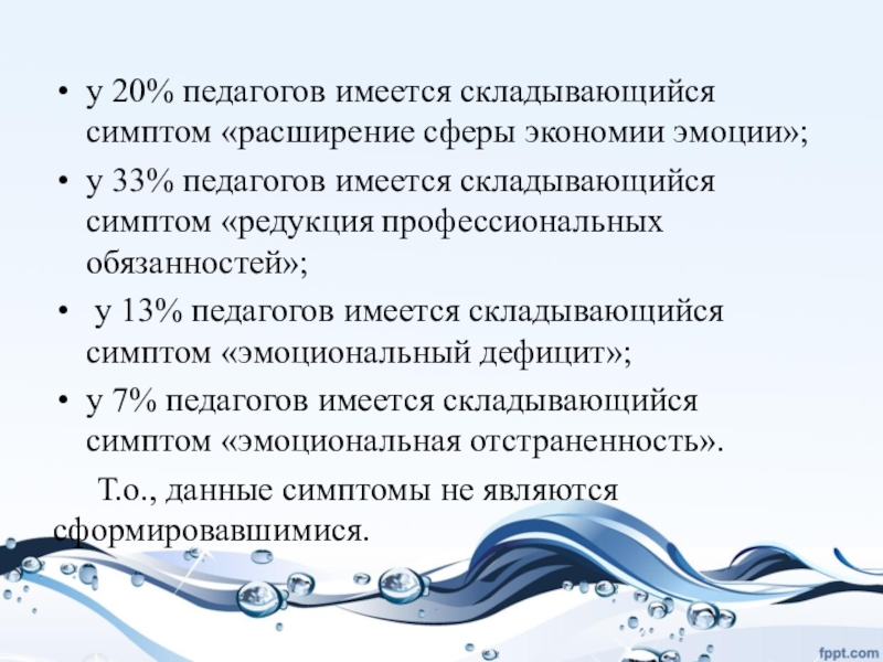 у 20% педагогов имеется складывающийся симптом «расширение сферы экономии эмоции»;