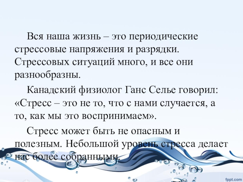 Канадский физиолог Ганс Селье говорил: «Стресс – это не то, что с нами случается, а то, как мы это воспринимаем».