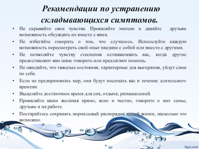 Слайд 7 Рекомендации по устранению складывающихся симптомов.