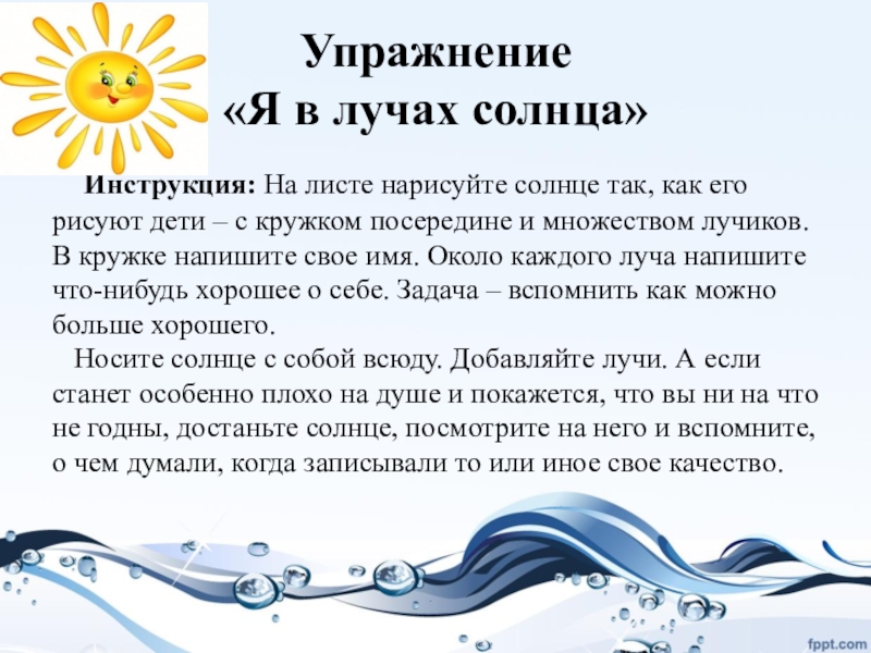 рисуют дети – с кружком посередине и множеством лучиков. В кружке напишите свое имя. Около каждого луча напишите что-нибудь хорошее о себе. Задача – вспомнить как можно больше хорошего.