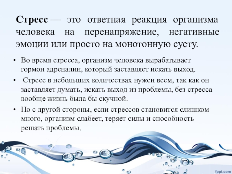 Слайд 9Стресс — это ответная реакция организма человека на перенапряжение, негативные эмоции или