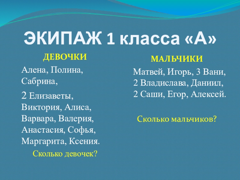 Матвей, Игорь, 3 Вани, 2 Владислава, Даниил, 2 Саши, Егор, Алексей.