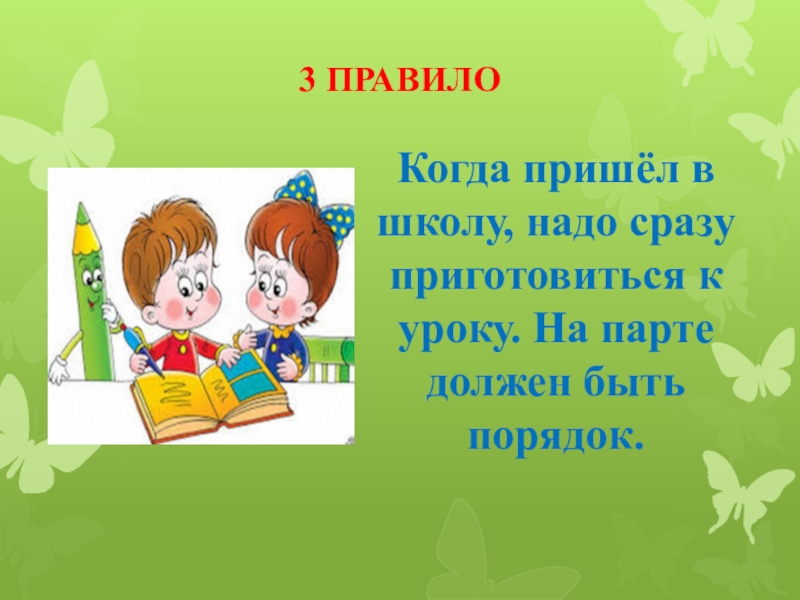 3 ПРАВИЛО  Когда пришёл в школу, надо сразу приготовиться к уроку. На парте должен быть порядок.