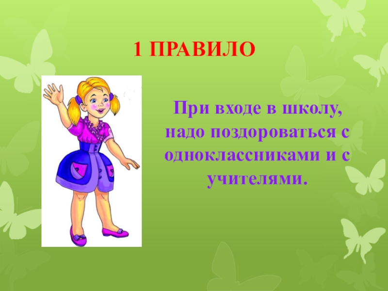 1 ПРАВИЛО При входе в школу, надо поздороваться с одноклассниками и с учителями.