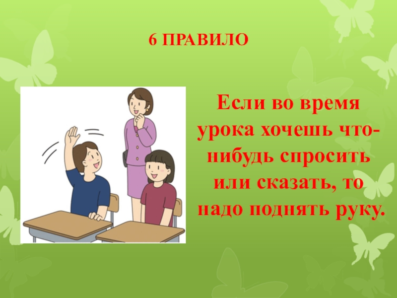 6 ПРАВИЛО  Если во время урока хочешь что-нибудь спросить или сказать, то надо поднять руку.