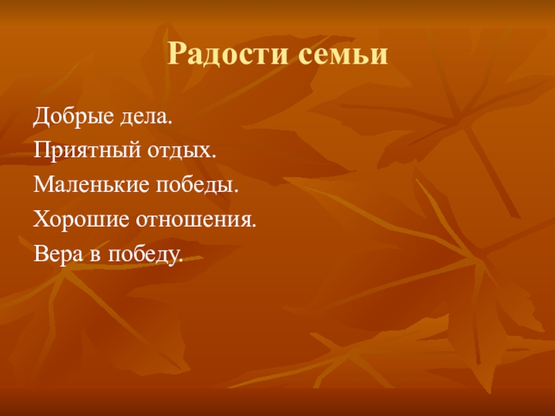 Радости семьиДобрые дела.Приятный отдых.Маленькие победы.Хорошие отношения.Вера в победу.