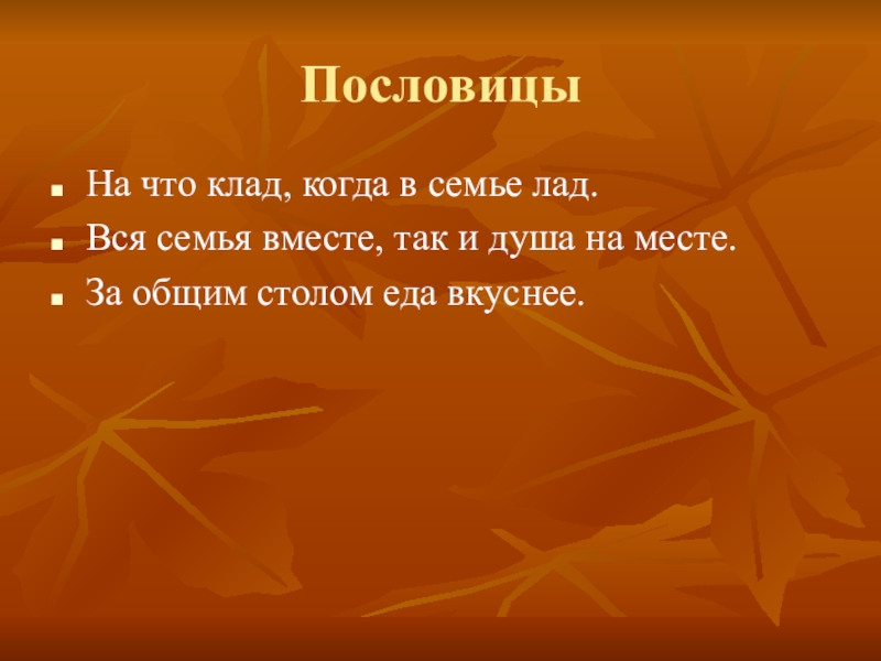 ПословицыНа что клад, когда в семье лад.Вся семья вместе, так и душа на месте.За общим столом еда