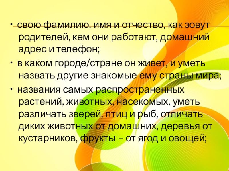 Слайд 3• свою фамилию, имя и отчество, как зовут родителей, кем они