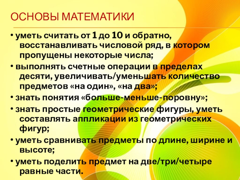 • уметь считать от 1 до 10 и обратно, восстанавливать