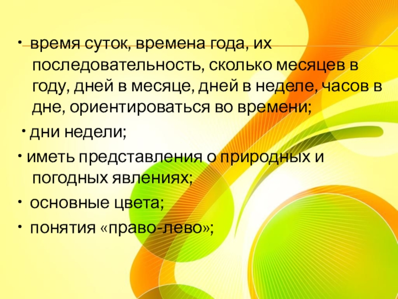 Слайд 4• время суток, времена года, их последовательность, сколько месяцев в году,