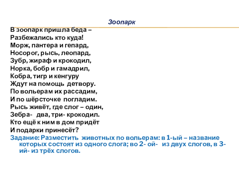 Задание: Разместить животных по вольерам: в 1-ый – название которых состоят из одного слога; во 2- ой- из двух слогов, в 3-ий- из трёх слогов.
