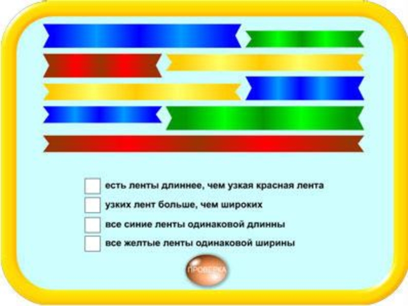 • уметь сравнивать предметы по длине, ширине и высоте;