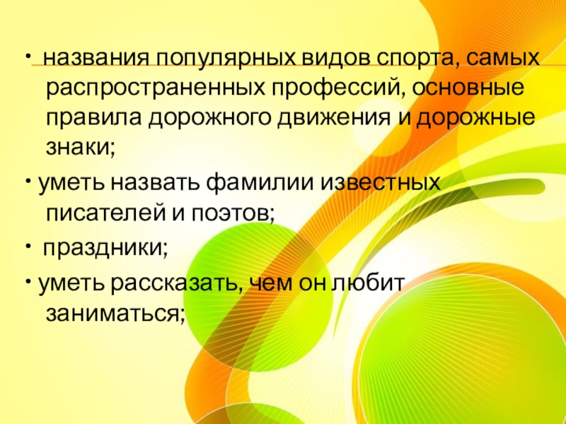 Слайд 5• названия популярных видов спорта, самых распространенных профессий, основные правила дорожного