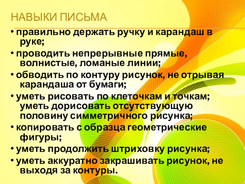 • уметь аккуратно закрашивать рисунок, не выходя за контуры.