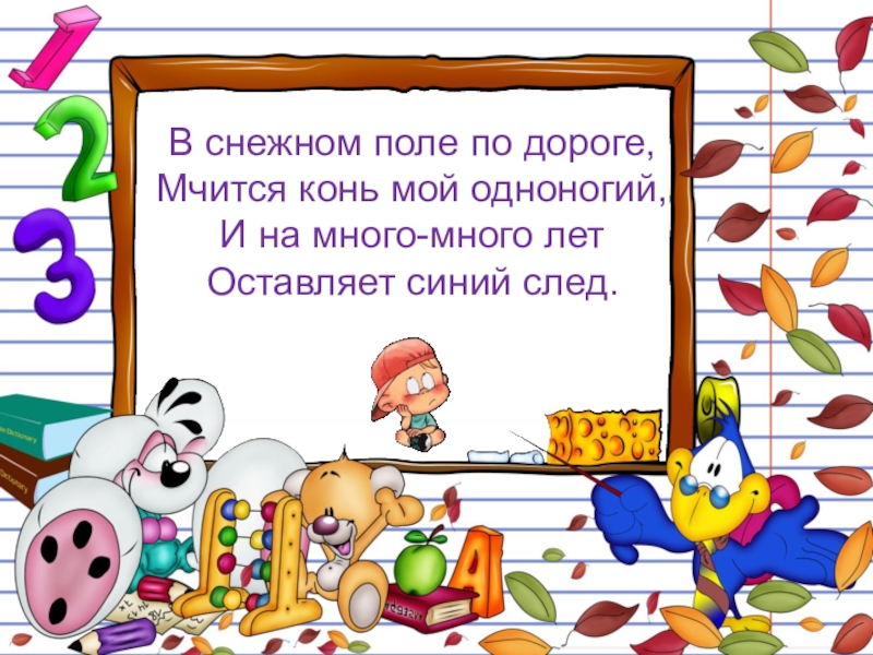 В снежном поле по дороге,Мчится конь мой одноногий,И на много-много летОставляет синий след.