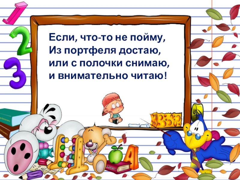 Если, что-то не пойму,Из портфеля достаю,или с полочки снимаю,и внимательно читаю!