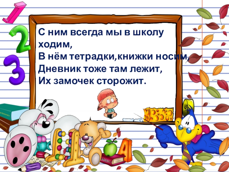 С ним всегда мы в школуходим,В нём тетрадки,книжки носим,Дневник тоже там лежит,Их замочек сторожит.