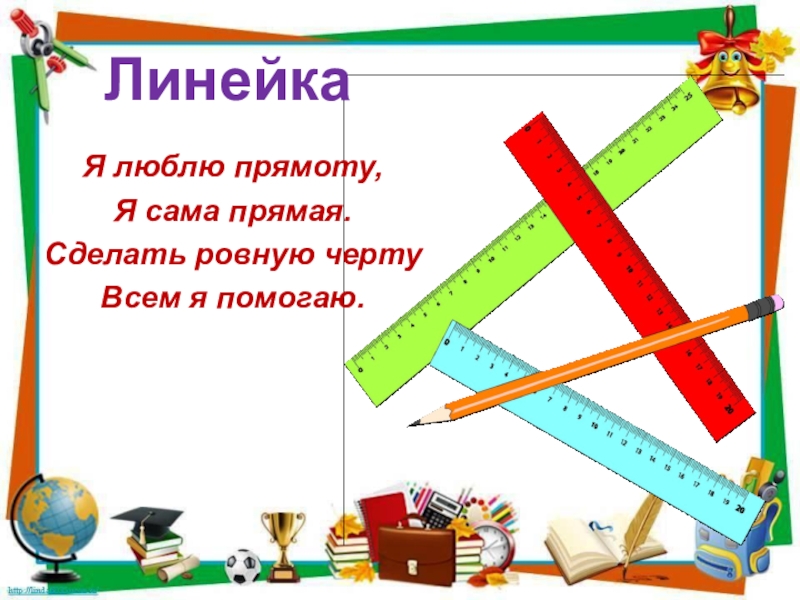 ЛинейкаЯ люблю прямоту,Я сама прямая.Сделать ровную чертуВсем я помогаю.