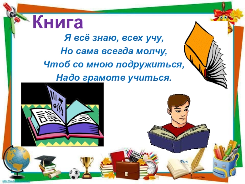 КнигаЯ всё знаю, всех учу,Но сама всегда молчу,Чтоб со мною подружиться,Надо грамоте учиться.