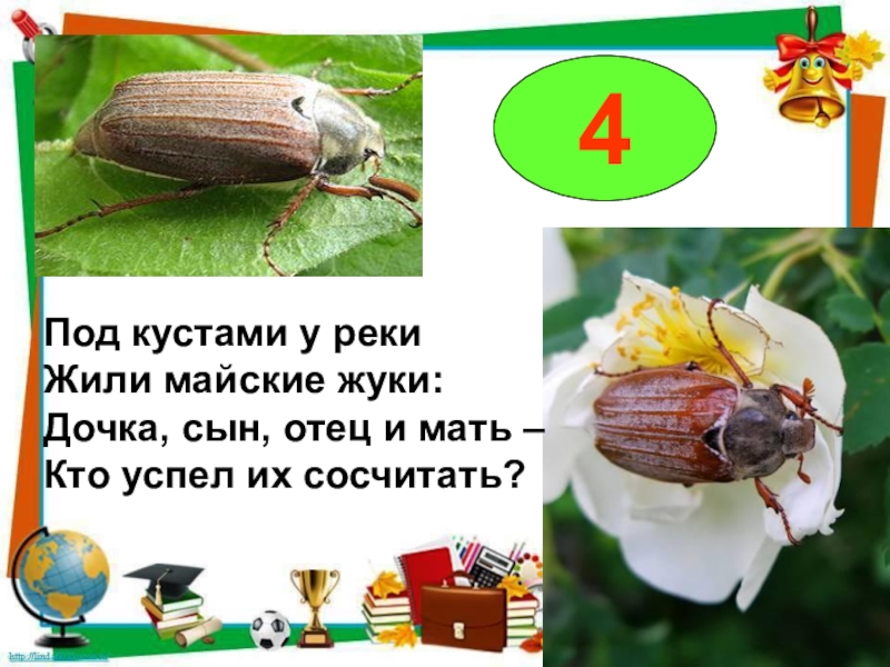 Под кустами у рекиЖили майские жуки:Дочка, сын, отец и мать – Кто успел их сосчитать?4