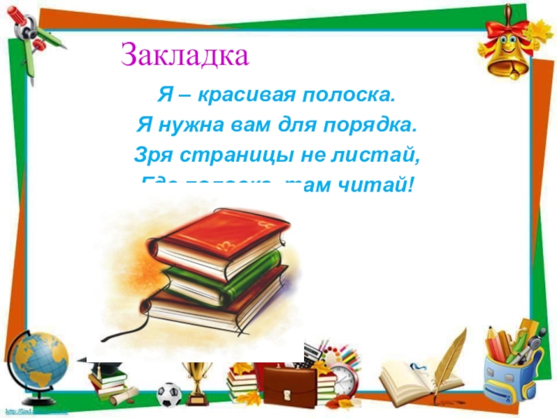 ЗакладкаЯ – красивая полоска.Я нужна вам для порядка.Зря страницы не листай,Где полоска, там читай!