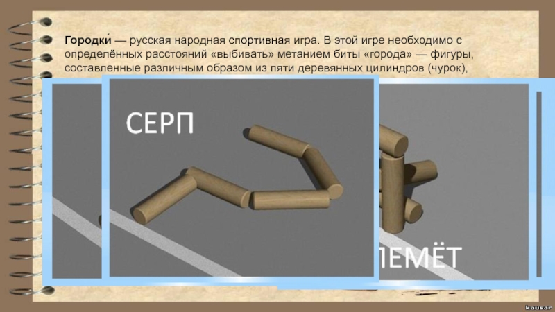 метанием биты «города» — фигуры, составленные различным образом из пяти деревянных цилиндров (чурок), называемых «городками» или «рюхами»