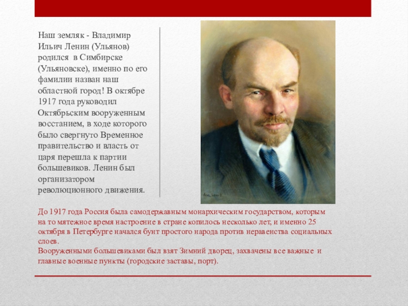 Наш земляк - Владимир Ильич Ленин (Ульянов) родился в Симбирске (Ульяновске), именно по его фамилии назван наш областной город! В октябре 1917 года руководил Октябрьским вооруженным восстанием, в ходе которого было свергнуто Временное правительство и власть от царя перешла к партии большевиков. Ленин был организатором революционного движения.