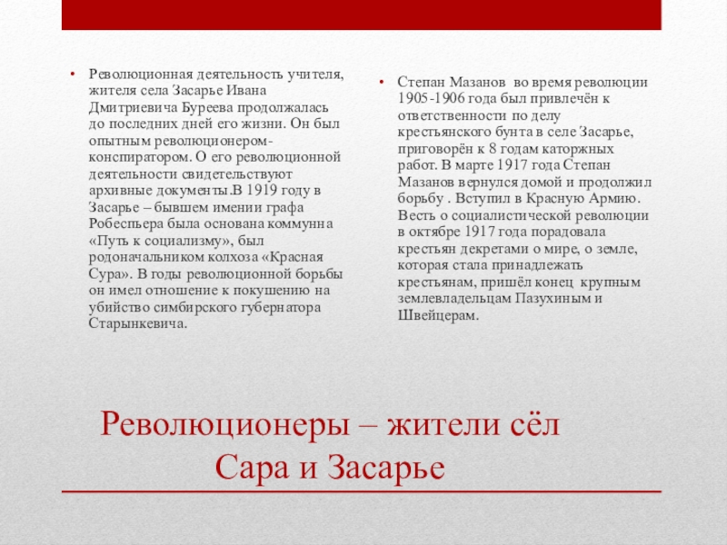 Степан Мазанов во время революции 1905-1906 года был привлечён к ответственности по делу крестьянского бунта в селе Засарье, приговорён к 8 годам каторжных работ. В марте 1917 года Степан Мазанов вернулся домой и продолжил борьбу . Вступил в Красную Армию. Весть о социалистической революции в октябре 1917 года порадовала крестьян декретами о мире, о земле, которая стала принадлежать крестьянам, пришёл конец крупным землевладельцам Пазухиным и Швейцерам.