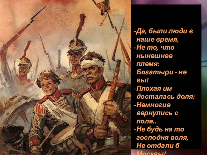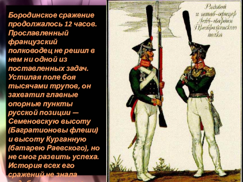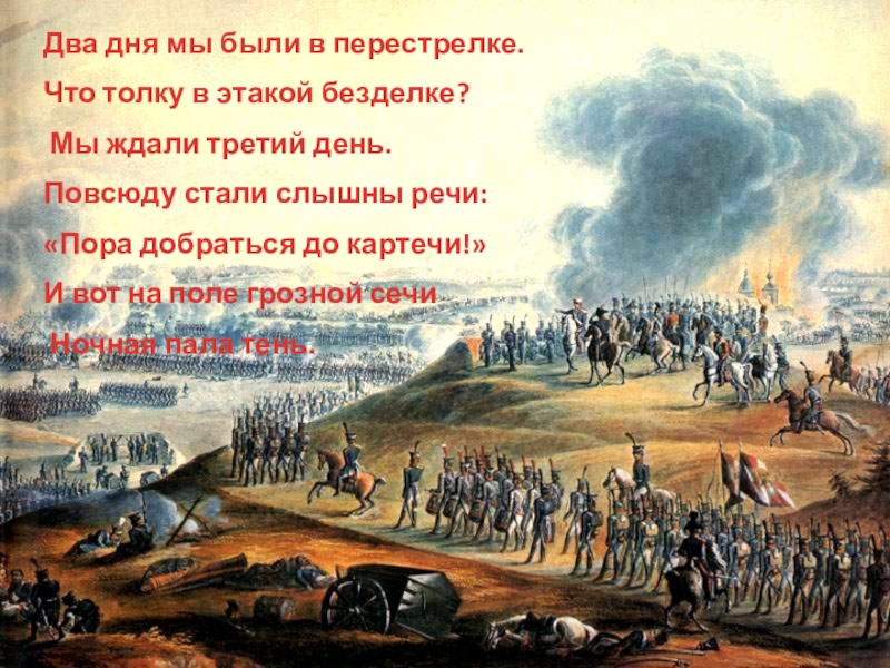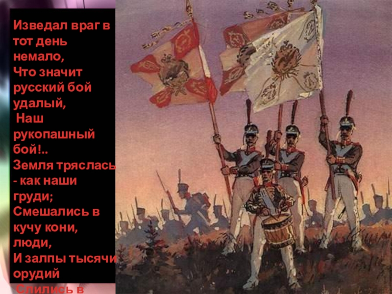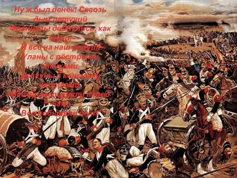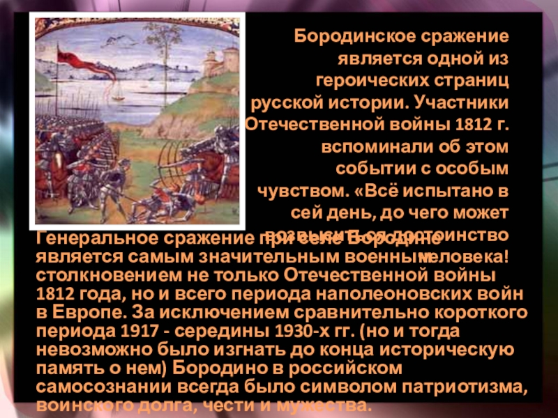 Бородинское сражение является одной из героических страниц русской истории. Участники Отечественной войны 1812 г. вспоминали об этом событии с особым чувством. «Всё испытано в сей день, до чего может возвыситься достоинство человека!