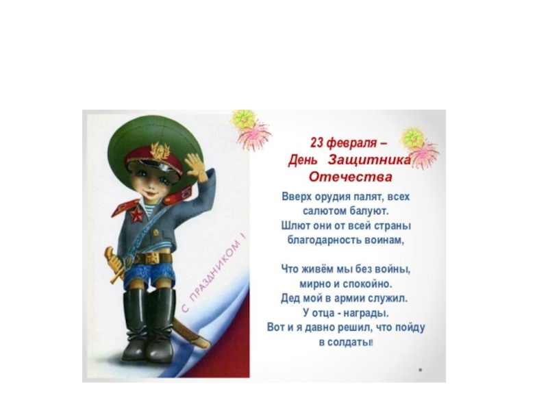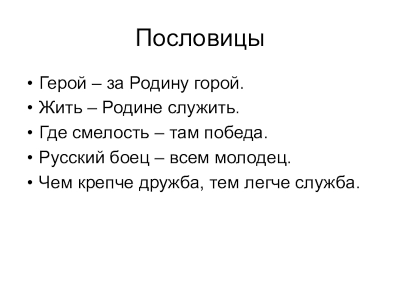 Пословицы Герой – за Родину горой.Жить – Родине служить.Где смелость – там победа.Русский боец – всем молодец.Чем