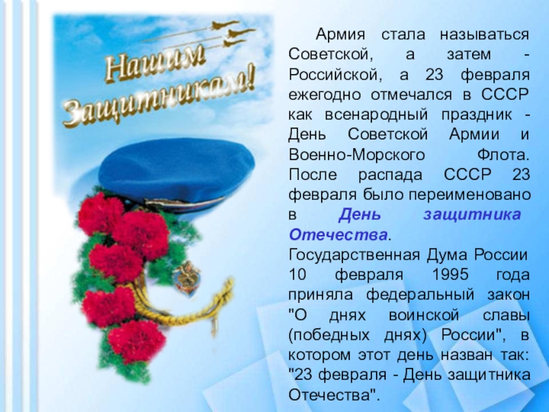 Слайд 12 Армия стала называться Советской, а затем - Российской, а 23 февраля