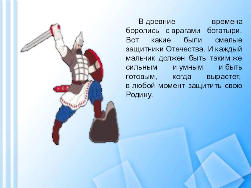Слайд 5 В древние времена боролись с врагами богатыри. Вот какие были смелые защитники Отечества.