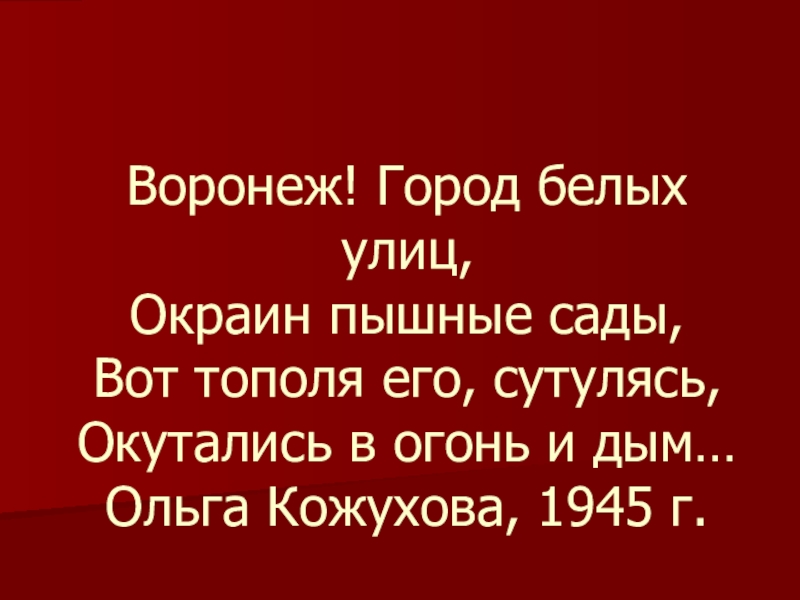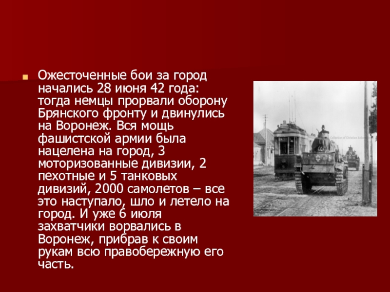 прорвали оборону Брянского фронту и двинулись на Воронеж. Вся мощь фашистской армии была нацелена на город, 3 моторизованные дивизии, 2 пехотные и 5 танковых дивизий, 2000 самолетов – все это наступало, шло и летело на город. И уже 6 июля захватчики ворвались в Воронеж, прибрав к своим рукам всю правобережную его часть.