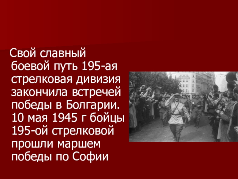 в Болгарии. 10 мая 1945 г бойцы 195-ой стрелковой прошли маршем победы по Софии