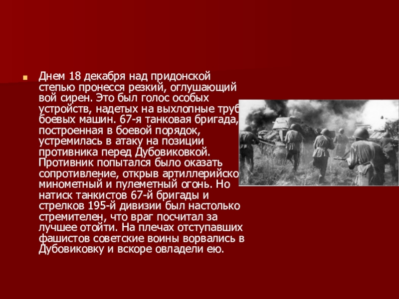 Это был голос особых устройств, надетых на выхлопные трубы боевых машин. 67-я танковая бригада, построенная в боевой порядок, устремилась в атаку на позиции противника перед Дубовиковкой. Противник попытался было оказать сопротивление, открыв артиллерийско-минометный и пулеметный огонь. Но натиск танкистов 67-й бригады и стрелков 195-й дивизии был настолько стремителен, что враг посчитал за лучшее отойти. На плечах отступавших фашистов советские воины ворвались в Дубовиковку и вскоре овладели ею.