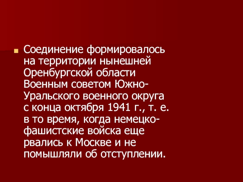 Соединение формировалось на территории нынешней Оренбургской области Военным советом Южно-Уральского военного