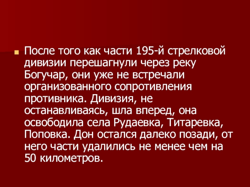 После того как части 195-й стрелковой дивизии перешагнули через реку Богучар,