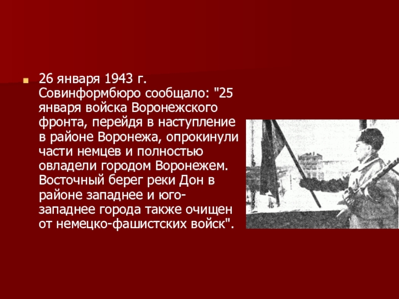 26 января 1943 г. Совинформбюро сообщало: "25 января войска Воронежского фронта,