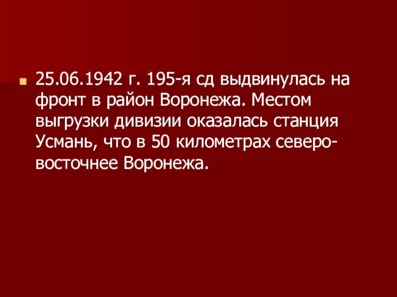 25.06.1942 г. 195-я сд выдвинулась на фронт в район Воронежа. Местом